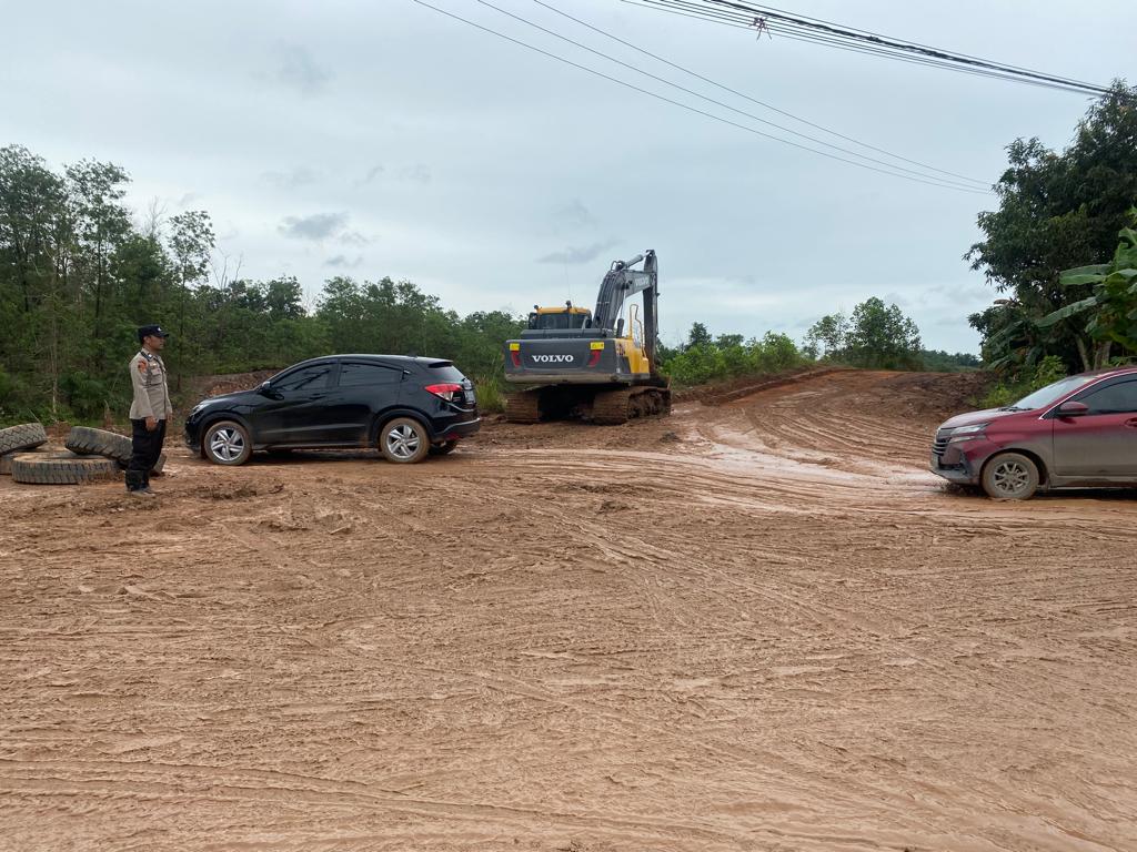 jalan alternatif – buka tutup jalur alternatif di km 171 Satui Barat. Petugas dari Polsek dan Polres juga sudah standby 1×24 di lokasi jalan longsor